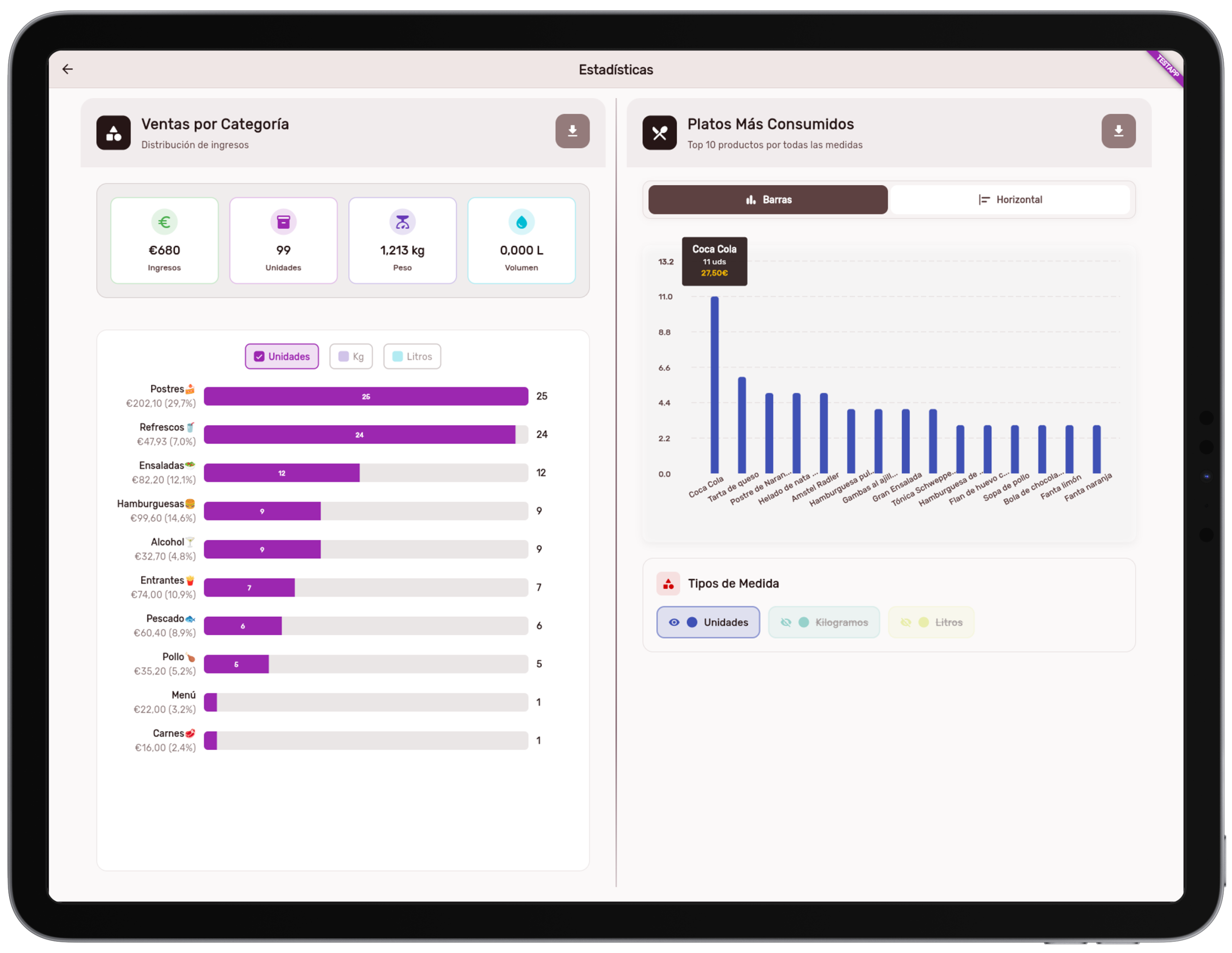 Accede a estadísticas clave como los platos estrella y los horarios con mayor afluencia